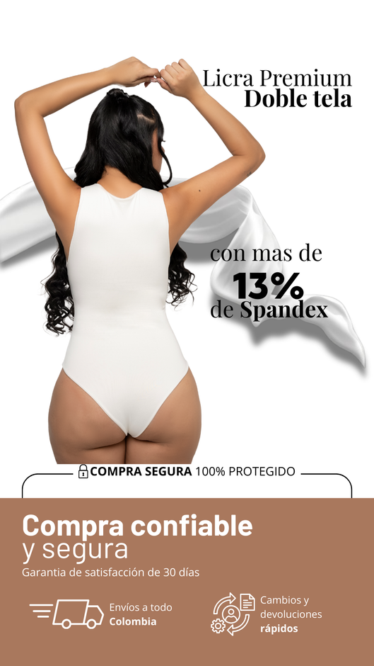 Composición: 87% Poliéster, 13% Elastano (Licra Premium Doble Capa). Cuidado: Lavar a mano con agua fría, no usar blanqueador, secar a la sombra, no planchar o hacerlo con un trapo o tela de protección sobre la prenda para evitar contacto directo de la plancha con la licra.