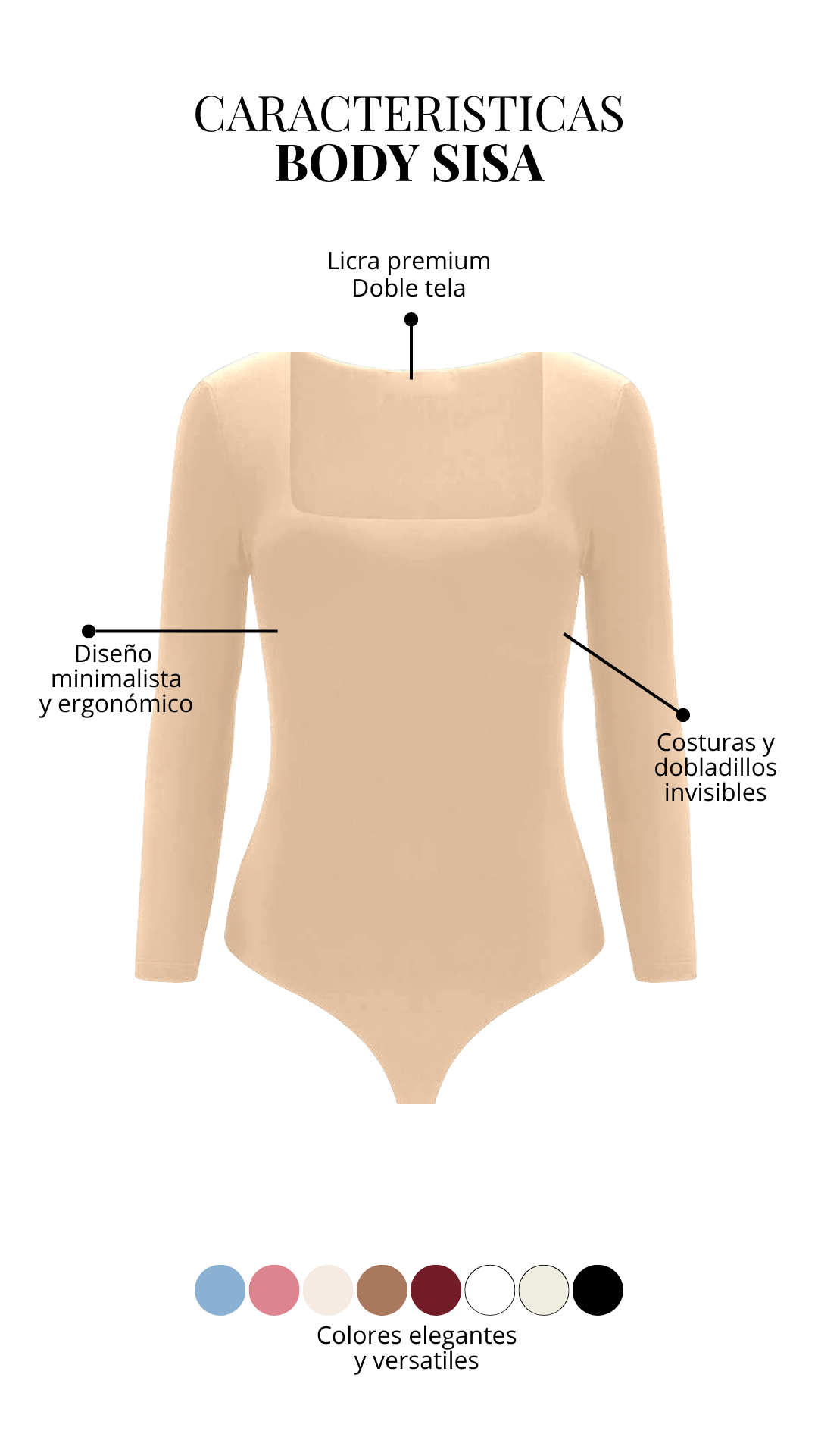 Nuestro Body Luxe manga larga, confeccionado en licra premium (87% poliéster, 13% elastano) de alta calidad. Ajuste cómodo y elegante, con broche de 3 niveles en la entrepierna para mayor practicidad. Hecho en Colombia, ideal para looks versátiles y sofisticados.